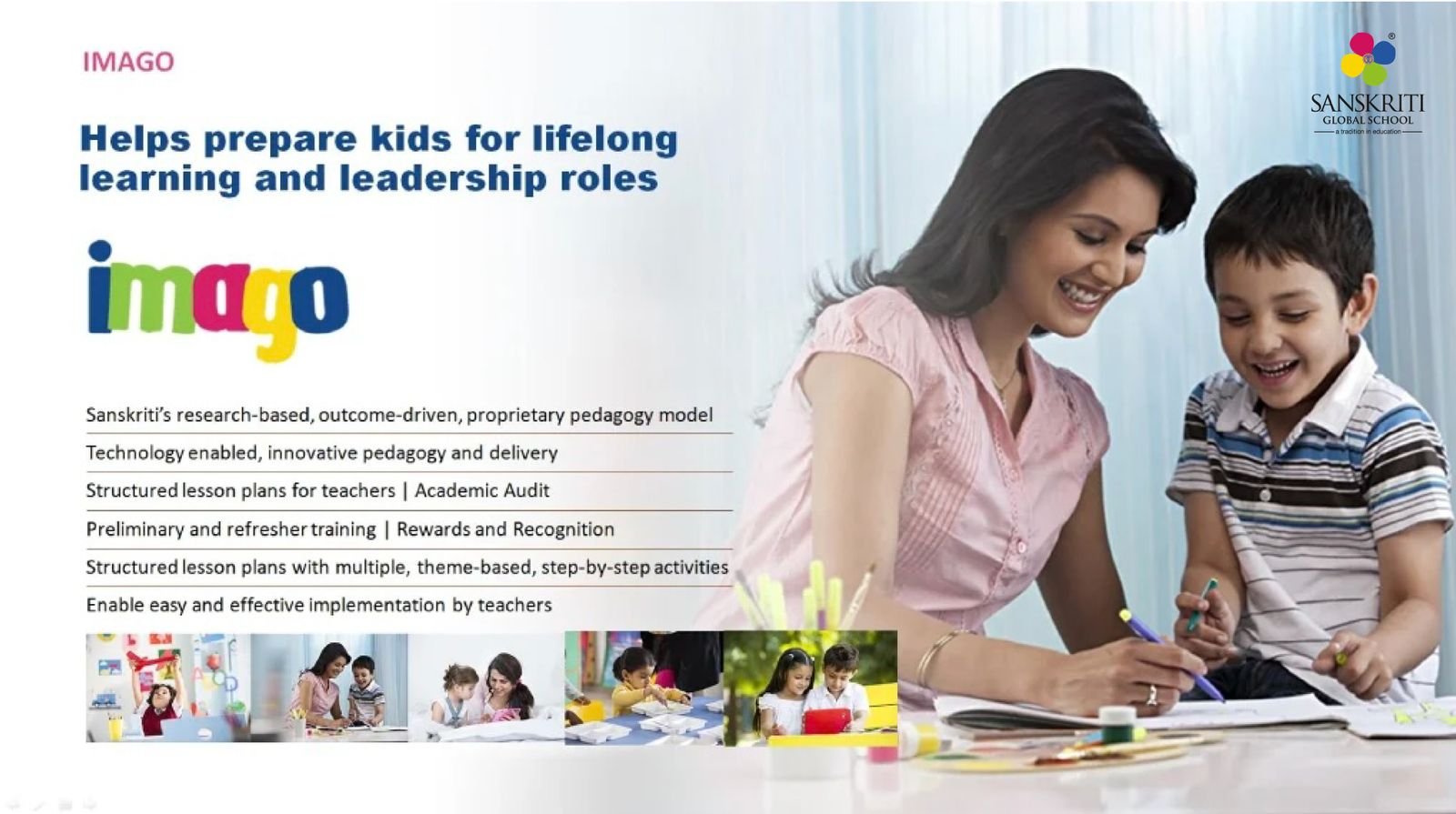 In the IMAGO curriculum, the child is developed holistically through “SEVEN SPHERES OF DEVELOPMENT APPROACH” – Creative, Collaborative, Conceptual, Connect, Comprehensive, Critical thinking and Cultural. This approach aims to develop compassionate and productive human beings who are capable of going global with deep cultural roots and leading an empowered life for themselves and those around them.